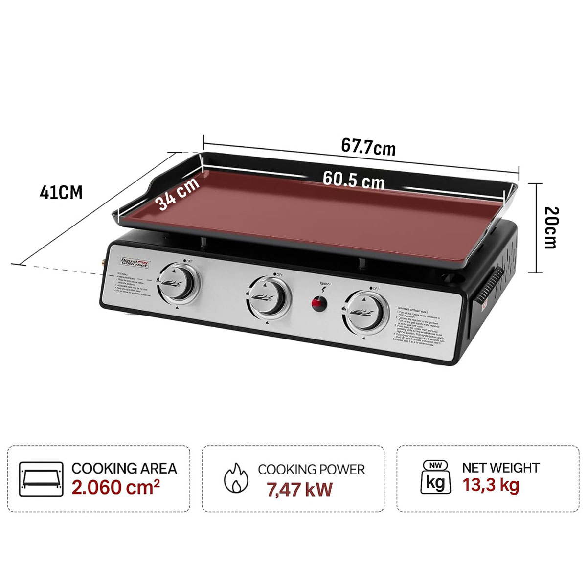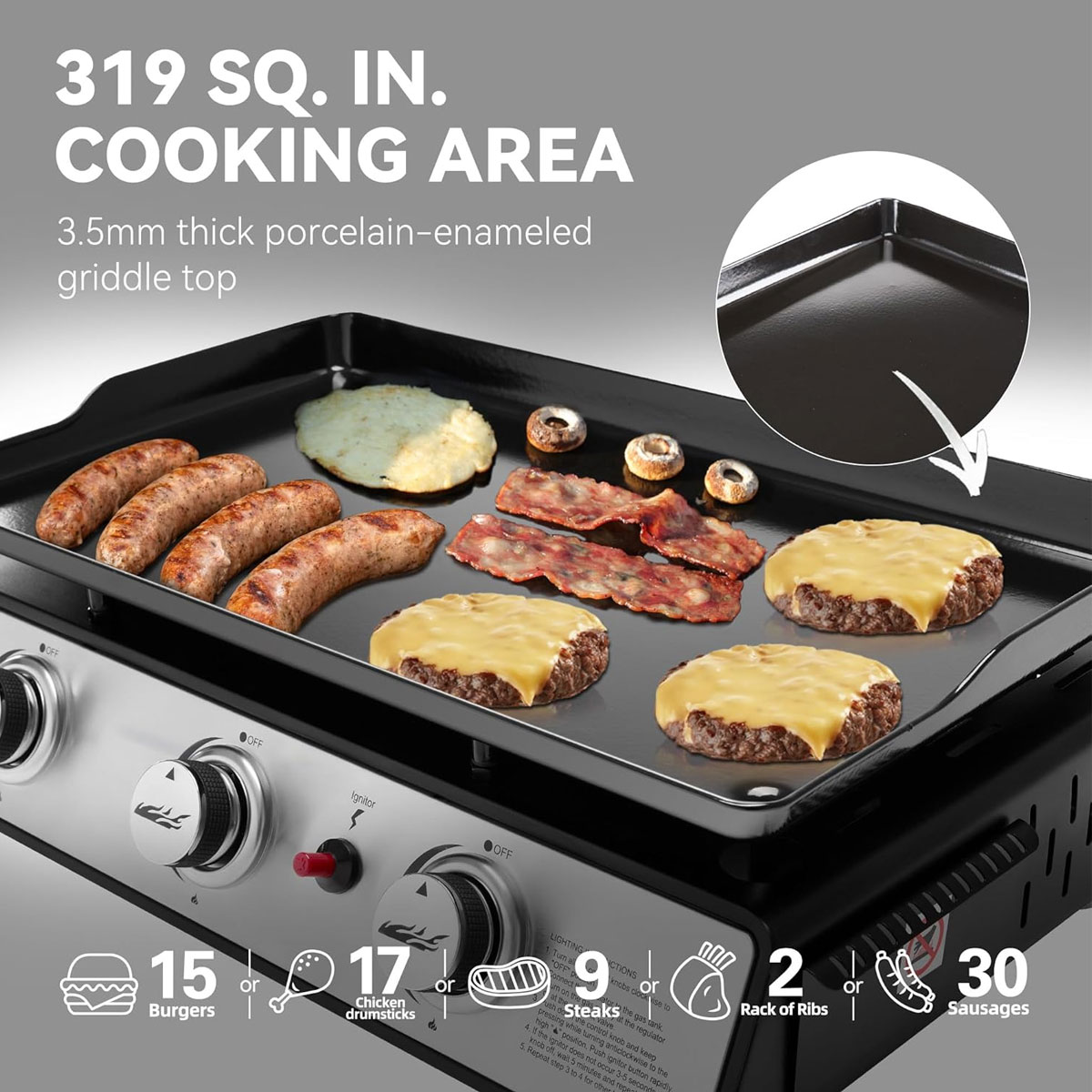Spacious Cooking Surface: With a total of 319 sq. in. cooking area, the 3.5 mm thick glossy porcelain-enameled steel griddle top accommodates 15 patties at the same time