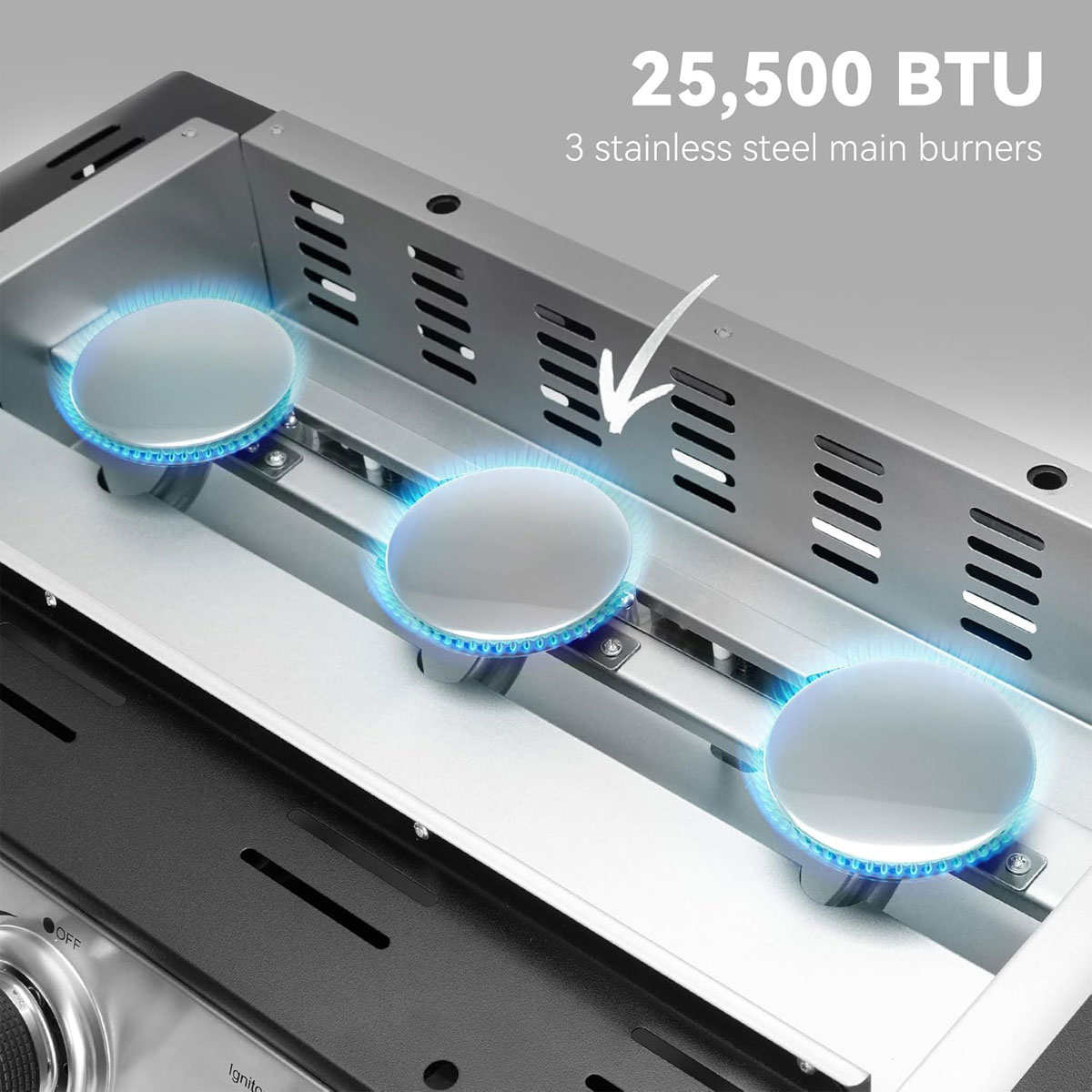 Fast Heating: Three separately controlled burners offer an overall of 25,500 BTU cooking power, while integrated piezo ignitor provides instant ignition featuring by the simple push of a button