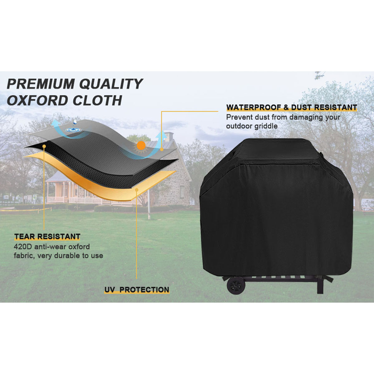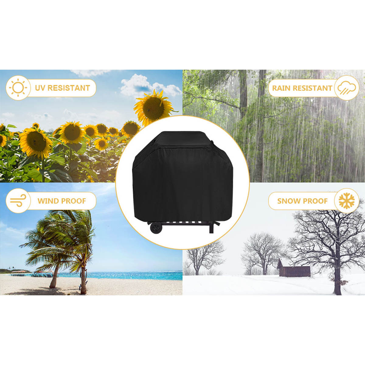 The adjustable straps with buckles and drawing string at the bottom can flexibly adjust the tightness of the cover so that it can sit and stay firmly over your outdoor BBQ grill, preventing it from being blown away by the wind.
