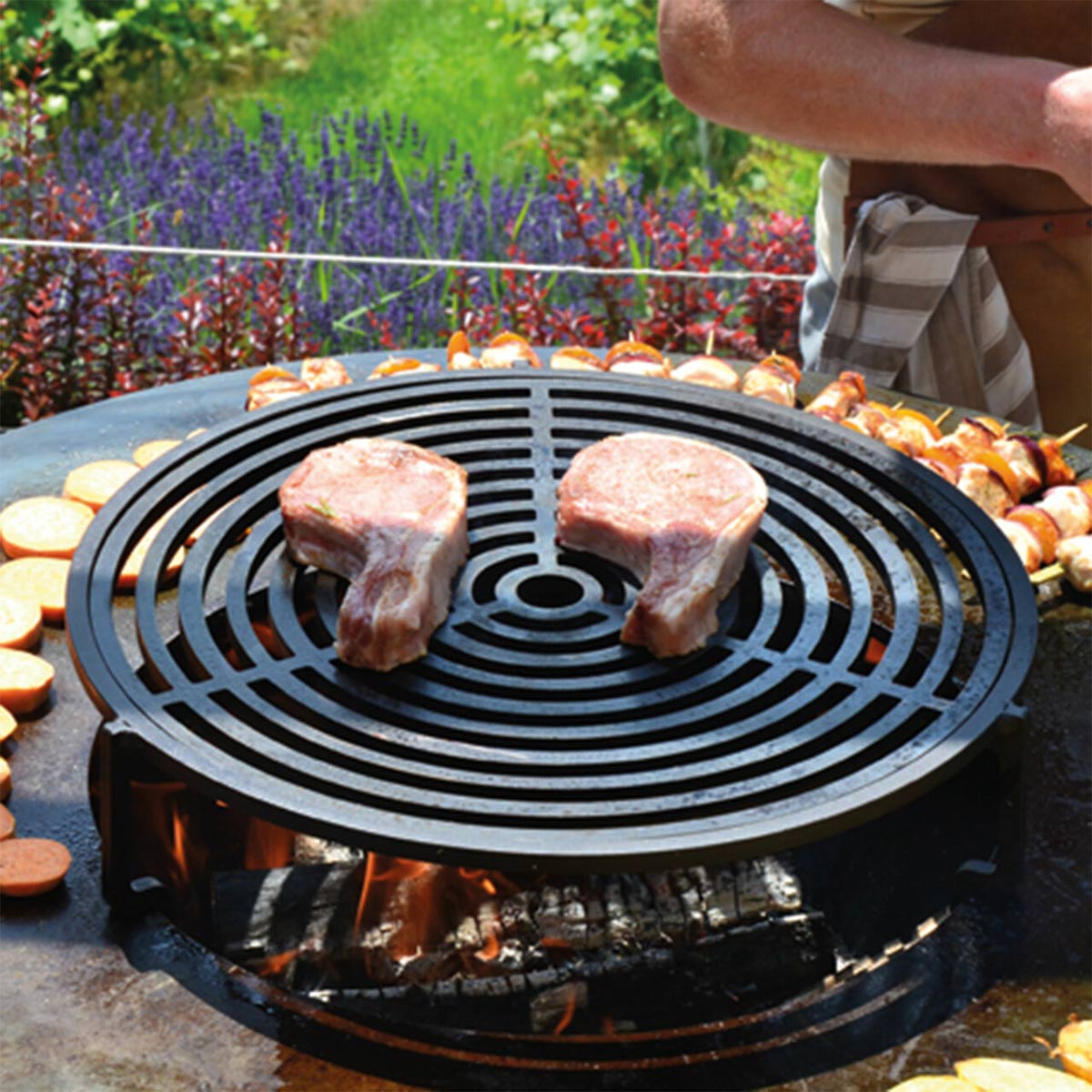 This sturdy two-piece grill is ideal for cooking larger cuts of meat on your OFYR cooking unit. Place the grill and stand (11.5cm high for 85 and 100 models and 25cm high for XL models) directly over the flames for a chargrilled taste. OFYR’s cooking plate remains unobstructed so you can cook other dishes at the same time, and with the stand in place even adding more wood to the fire is easy. As OFYR 85, 100 and XL Grill Accessories Set, the Grill Round is also available in combination with the Horizontal Skewers as described under 1.2. In that case the 85 set has a 11,5cm high stand and the 100 set a 21cm high stand whereas is the XL stand is 25cm high. And the OFYR® Grill Round XL is also part of the OFYR® XL Grill Accessories Set PRO that also includes the Horizontal Skewers Ring, the Brazilian Grill Ring, 3 Skewers 105 (see 1.2 and 1.3) and a Snuff er XL