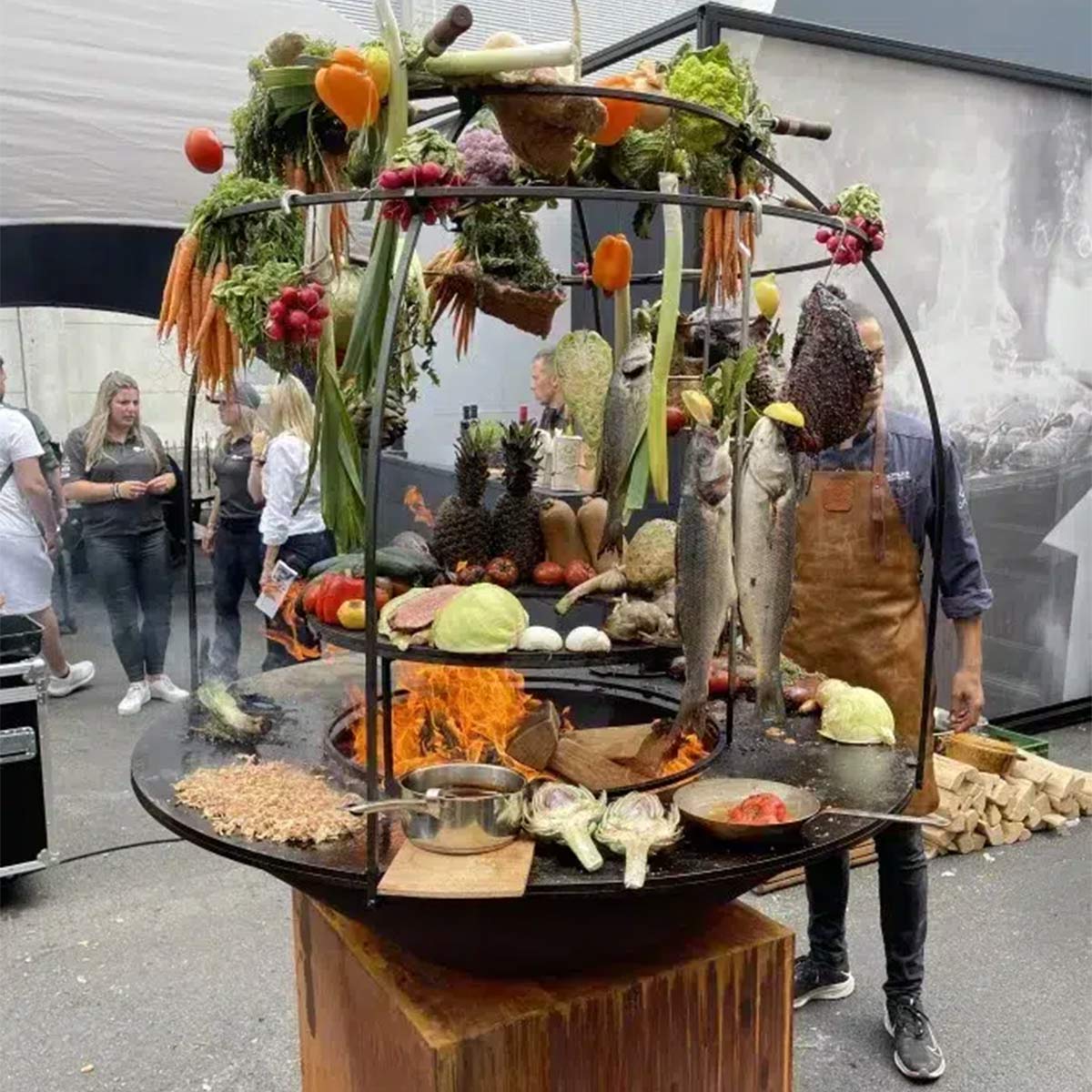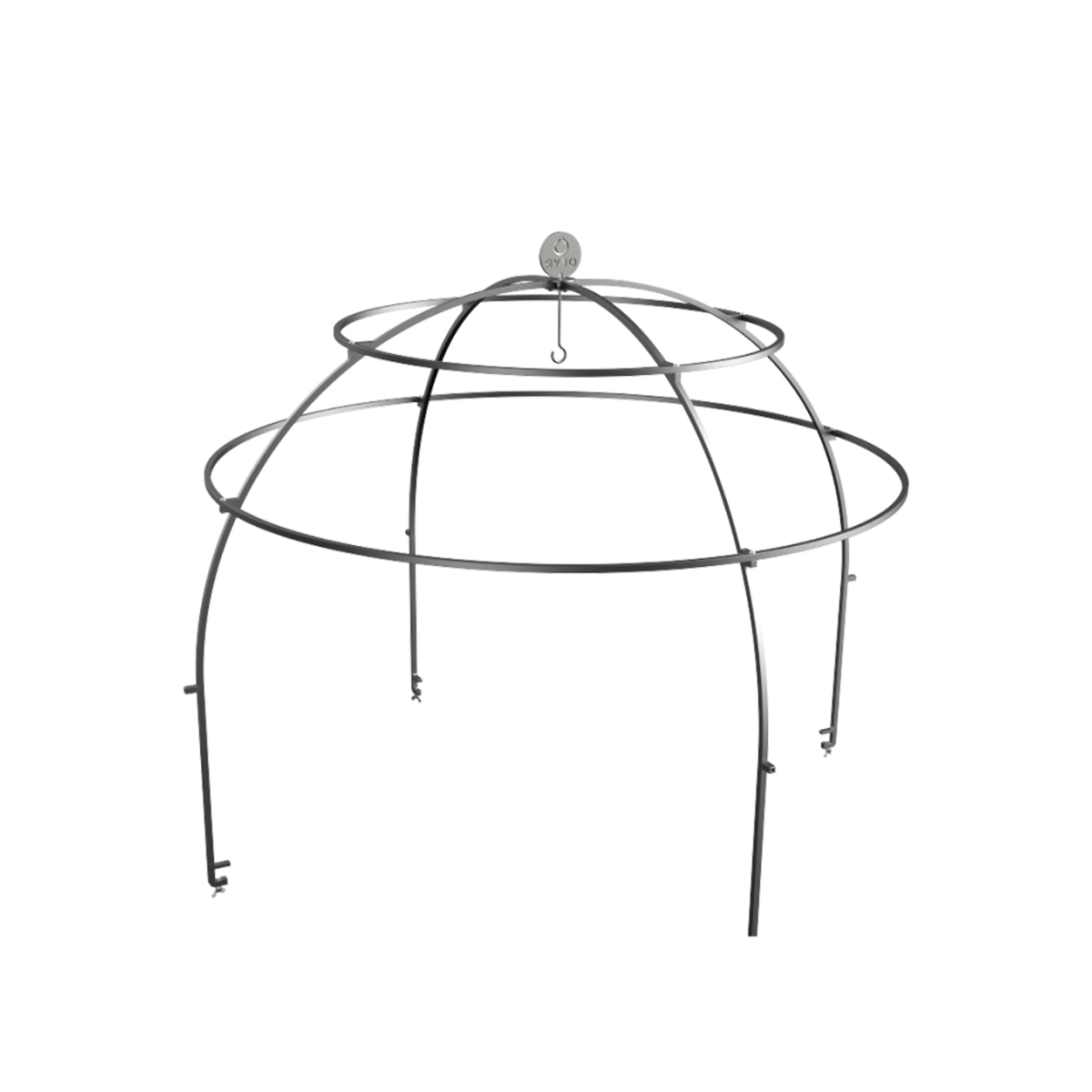 The OFYR Cage is the perfect accessory for professionals who love to show cook. Its dome-like structure allows food to be suspended from the steel beams, creating a unique and interactive visual element. The heat from the fire slowly cooks ingredients, from meat and fish to fruits and vegetables. Since the Cage is secured on the outer edge of the plate, the cooking surface remains free to prepare other dishes. Ingredients can be suspended from the beams with skewers and s-hooks.