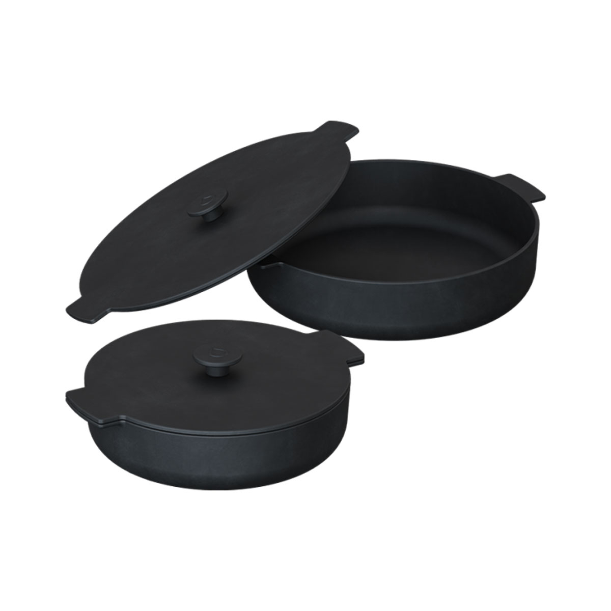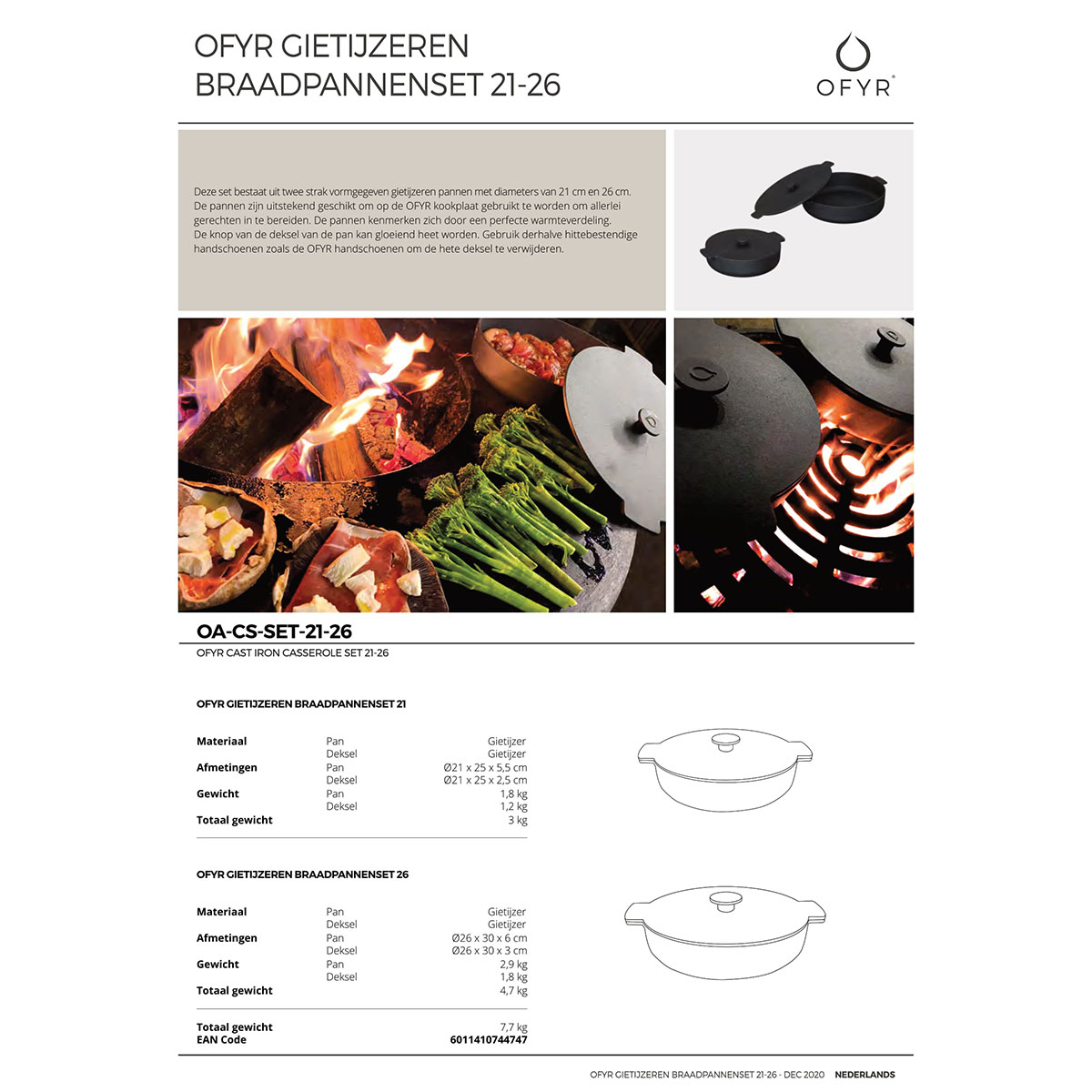 This set consists of two sleek cast iron pans with diameters of 21cm and 26cm. The pans are perfectly suited to be used on the OFYR cooking plate to prepare all kinds of dishes. The pans are characterized by perfect heat distribution. The knob on the lid of the pan can become very hot. Therefore, use heat-resistant gloves such as the OFYR gloves to remove the hot lid.