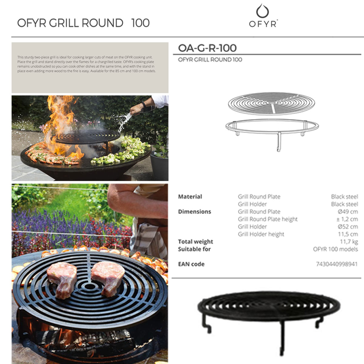 The sturdy two-piece grill is ideal for cooking larger cuts of meat on the OFYR cooking unit.