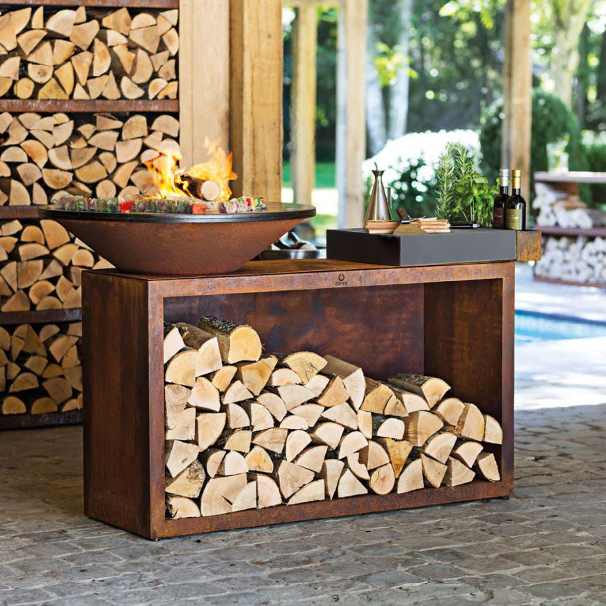 This all-in-one unit combines unbeatable style and functionality in a compact design. The OFYR Island provides everything you need for an ultimate outdoor cooking experience with friends or family. It includes an 85 cm or 100 cm OFYR cooking unit with wood storage, a chopping board and a handy accessories tray for utensils and condiments. The chopping board is available in teak wood or dark grey ceramic.