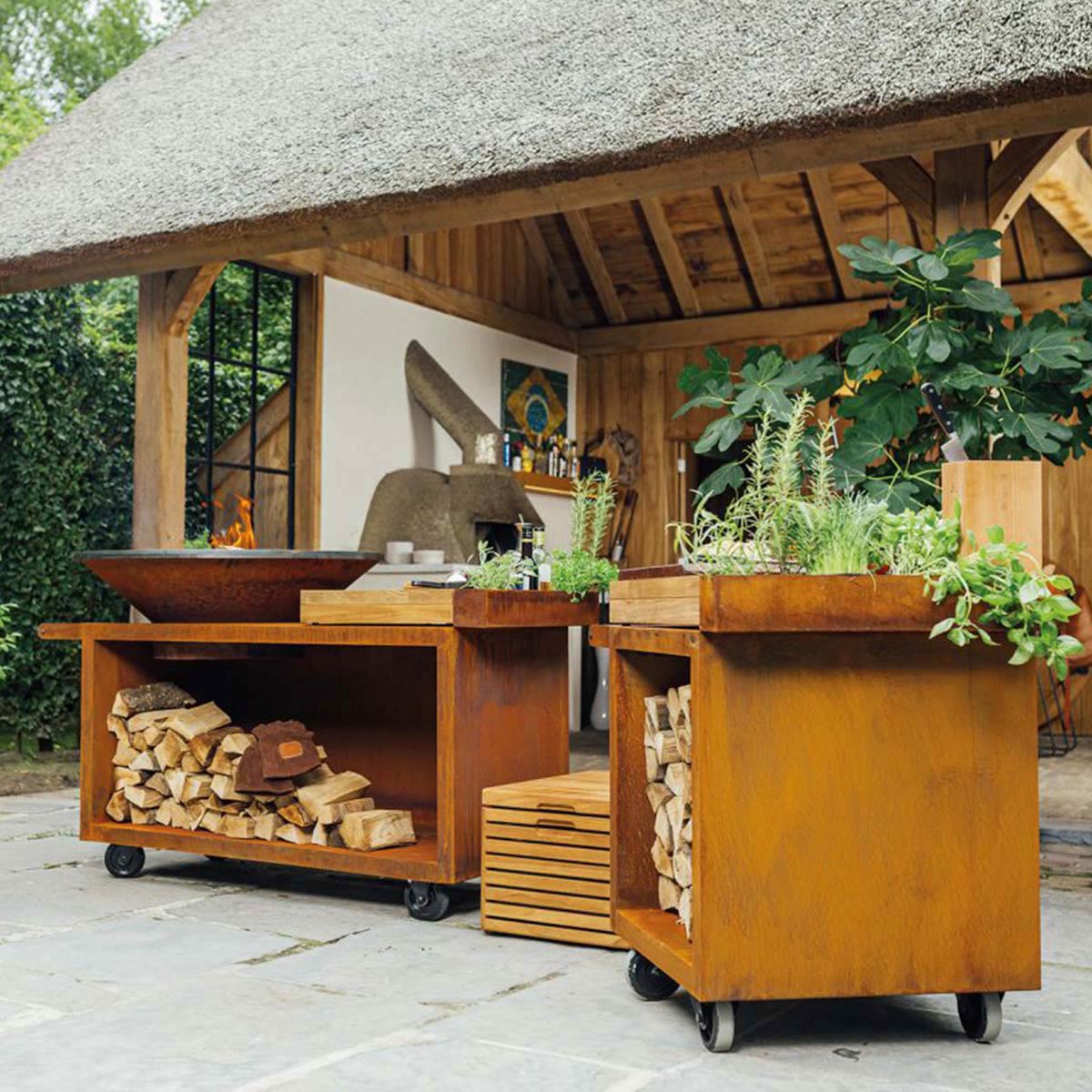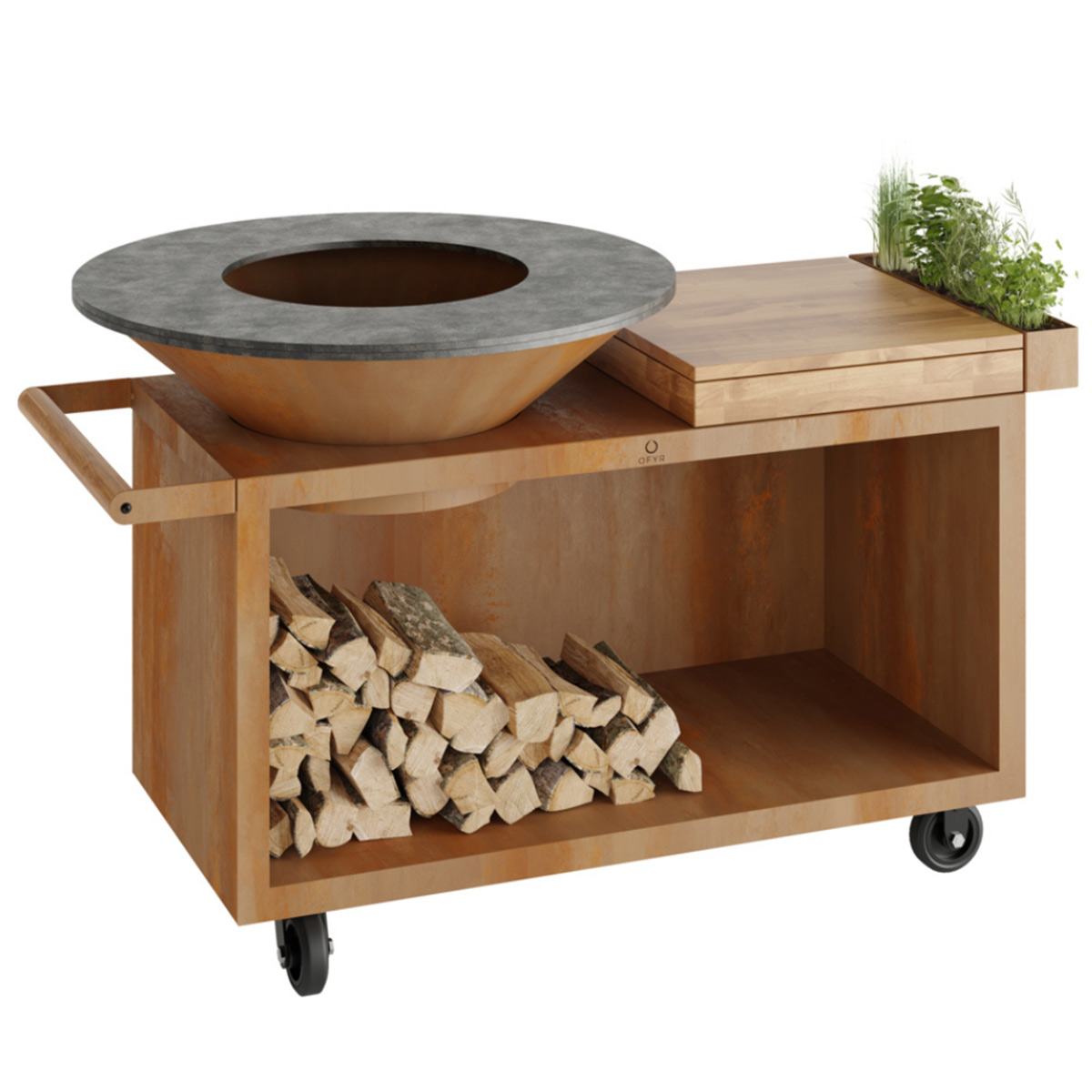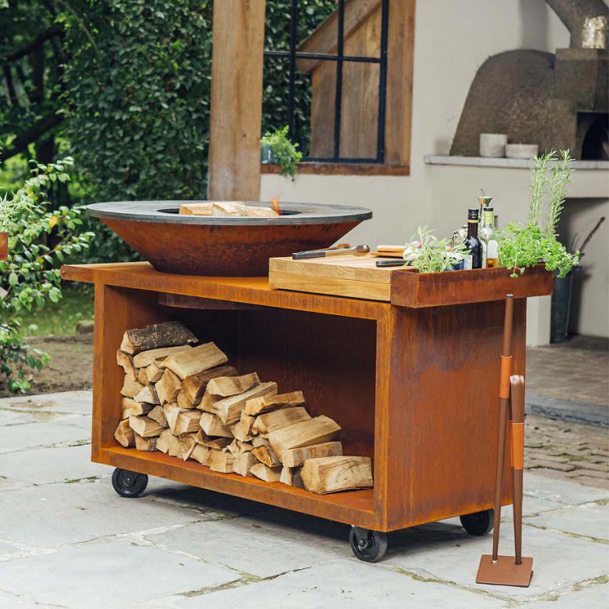 The OFYR Island Corten 100 PRO is the mobile version of the OFYR Island 100 with a deeper base. It includes a solid chopping board for food preparation, a handy accessories tray and space for under-counter wood storage. The chopping board is available in teak wood and dark grey ceramic.