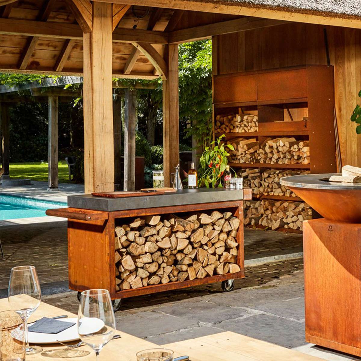 The OFYR Mise en Place Table Corten 135 PRO is incredibly handy to use with your cooking unit, allowing you more space to prepare your food. With the 135×65 cm, there is ample working space. The chopping board is available in teak wood and dark grey ceramic.