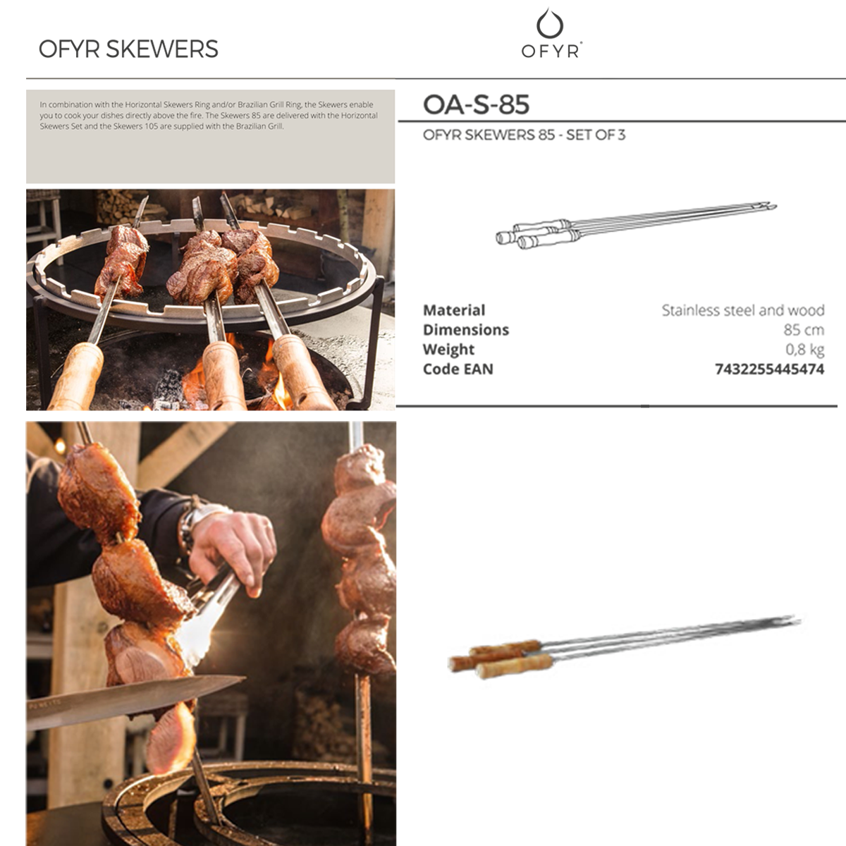 In combination with the Horizontal Skewers Ring or Brazilian Grill Ring, the skewers enable you to cook your dishes directly above the fire. The skewers 85 are delivered with the horizontal skewers set and the skewers 105 are supplied with the Brazilian grill.