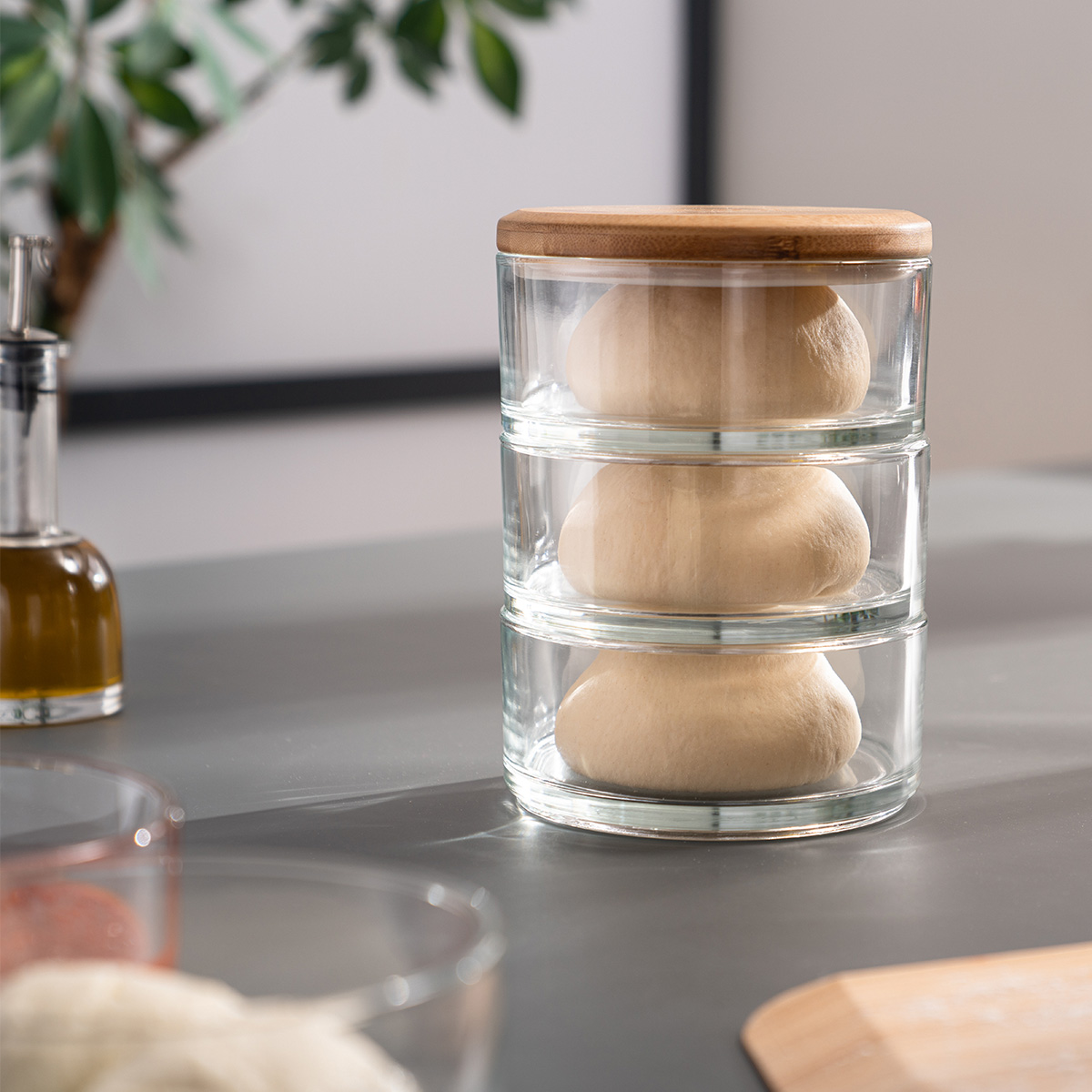3x glass bowls with a bamboo lid and removable seal.