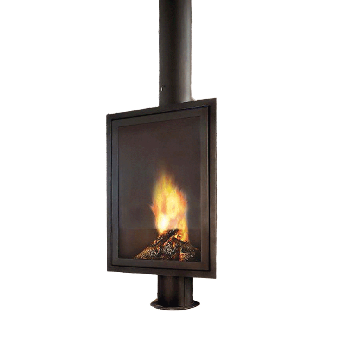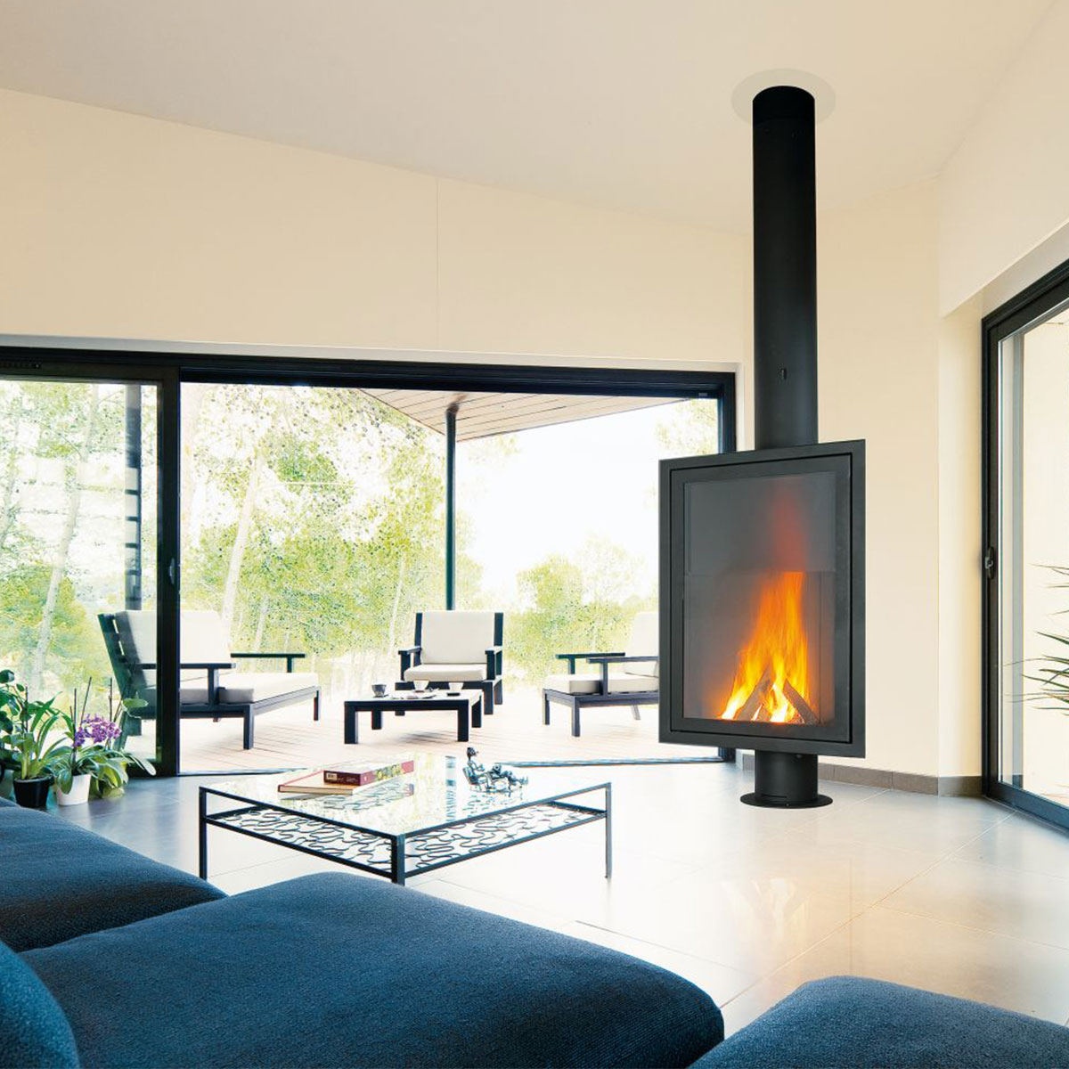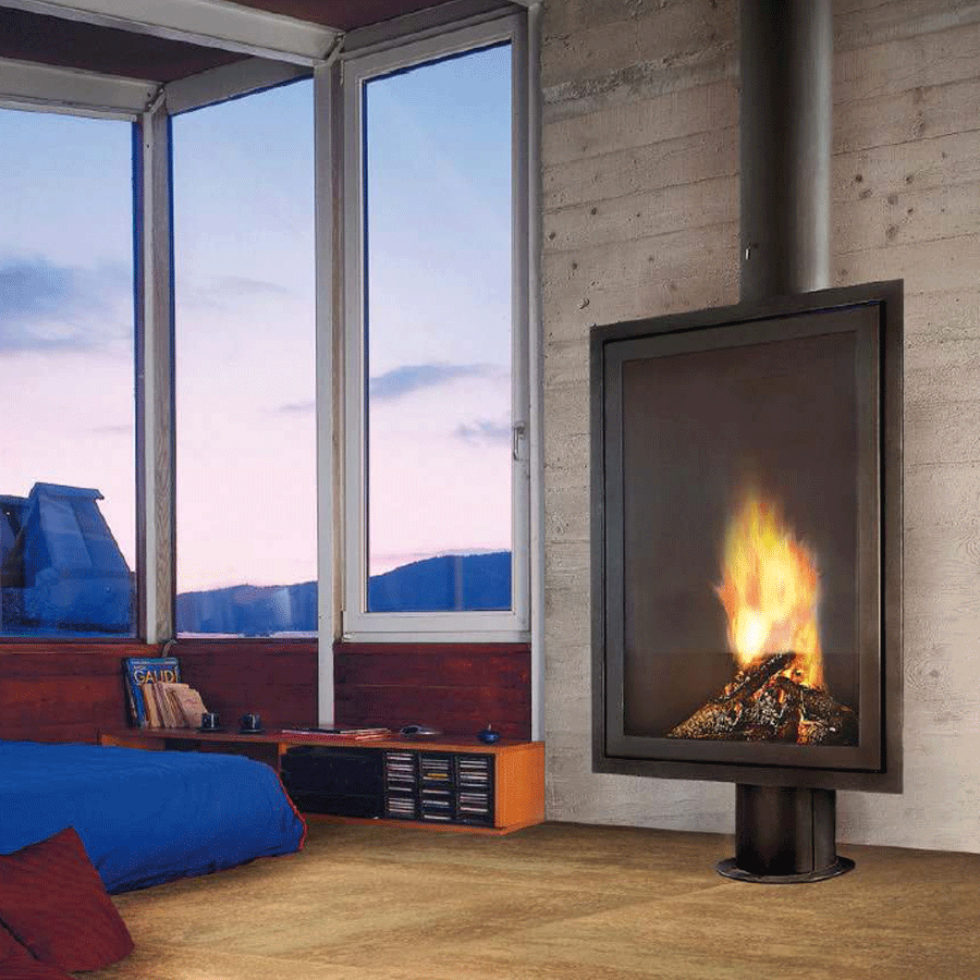 Audacious yet sober, this expansive fireplace proudly displays its flames in their full splendor.